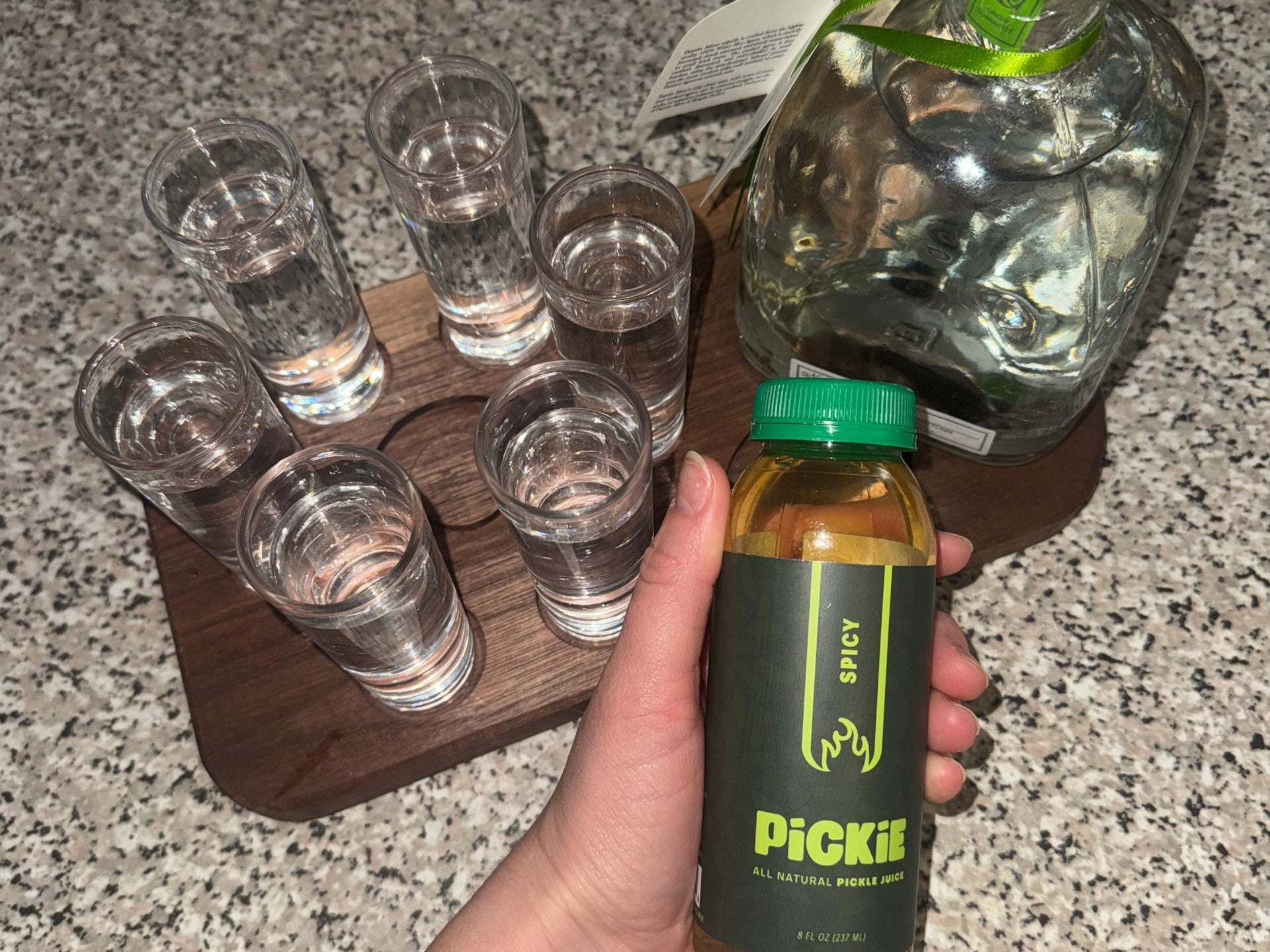 "Tequila shots just got a glow-up. Take a shot of tequila, then chase it with Spicy PiCKiE - your new favorite low-sugar, spicy chaser. I think it's the best way to keep the vibes going and avoid that post drinking hangover."